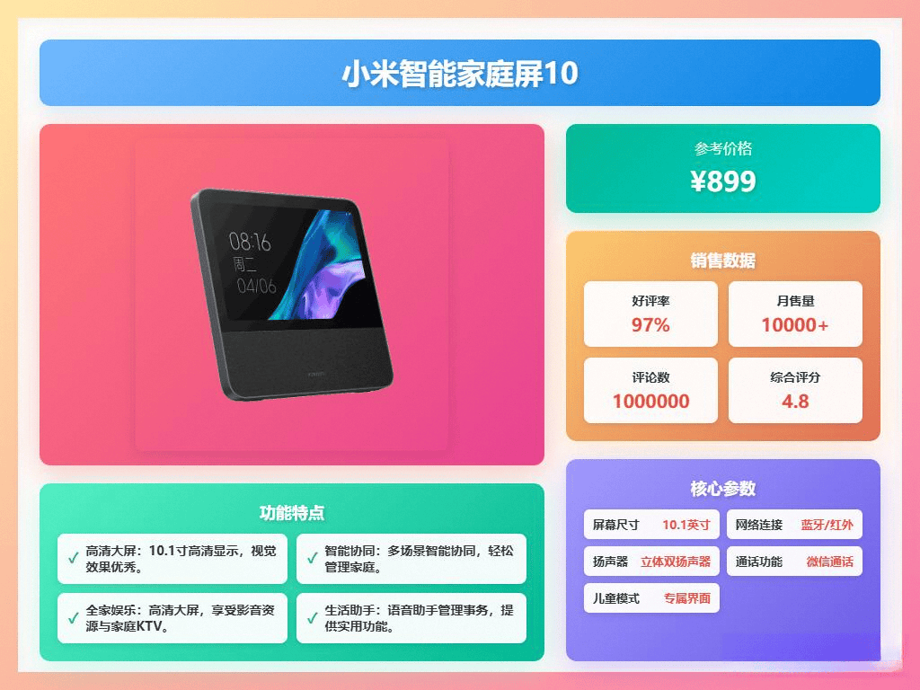 小米智能家庭屏10是一款集音响、显示屏和智能家居控制于一体的多功能设备。它搭载小米澎湃OS,能够连接5500+智能设备和6000+传统家电,兼容性极强,用户只需一句话就能操控全屋的灯光、温度和安全,简直是懒人福音。