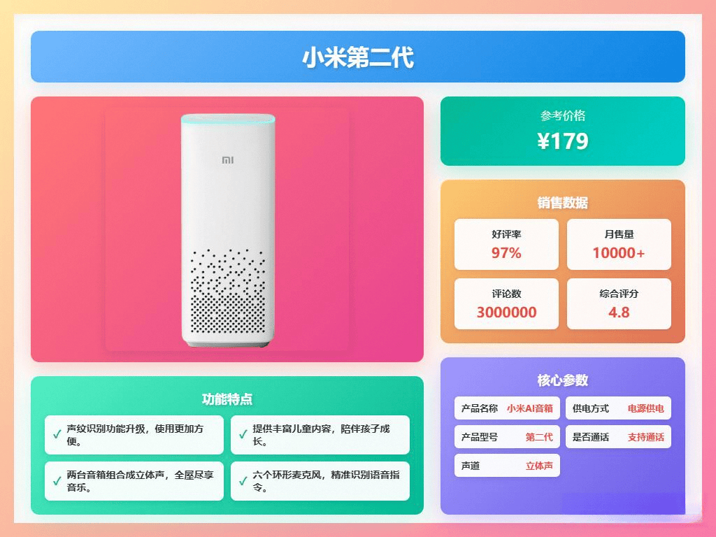 小米AI音箱第二代是一款智能家居的好帮手,内置小爱同学,用户只需动动嘴,就能轻松控制家中的智能设备,极大地方便了日常生活。它还拥有海量的有声内容,用户想听什么歌,只需让小爱同学搜索即可,支持和网易云音乐,曲库丰富,随时随地享受音乐。